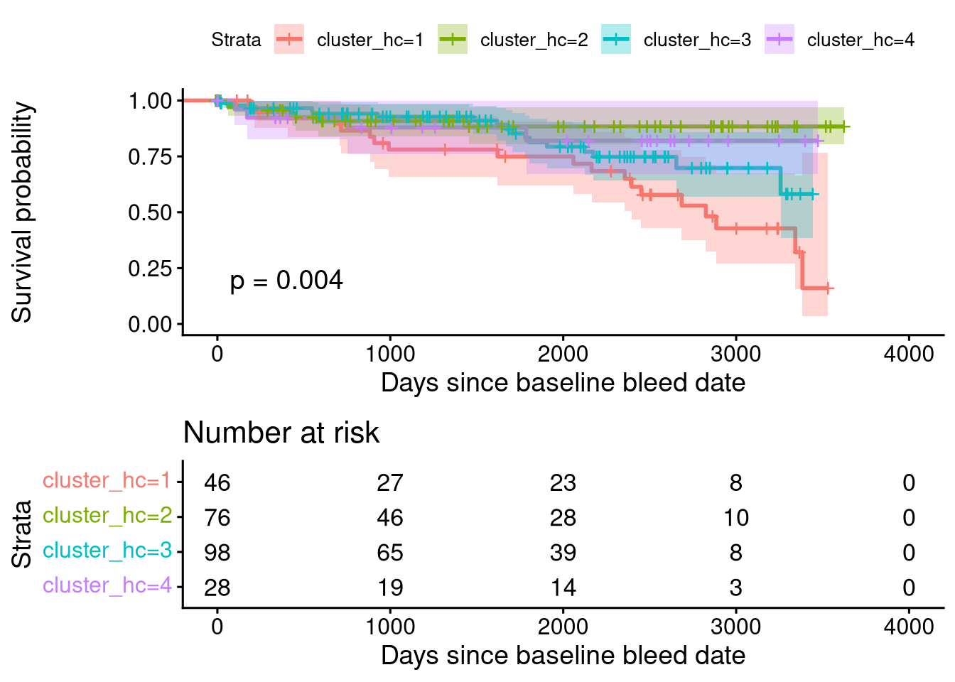 coxph(formula = Surv(survival_time, event) ~ cluster + age_at_bleed +