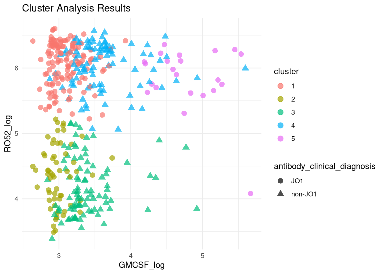 It seems there is a group of both JO1 and non-JO1 patients (groups 1 and 4, respectively), with high RO52 and low GMCSF, who have an increased hazard (for group 1: HR 3.3507099 [95% CI 1.2404952, 9.050625]) relative to patients with low RO52, regardless of their GMCSF levels.