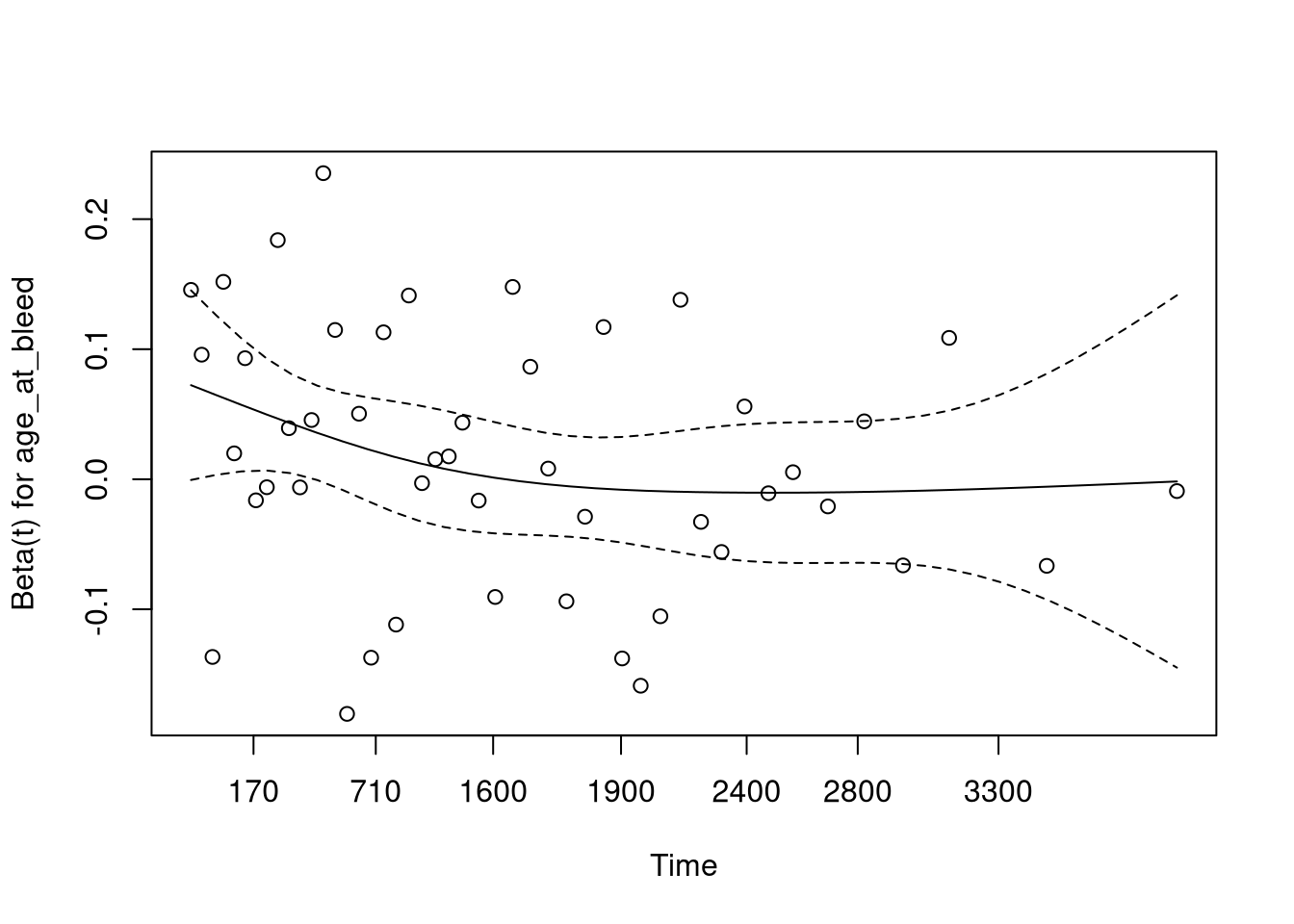 This plot (and table printed above) suggests that the hazard from age is not proportional, meaning the model assumptions are violated.